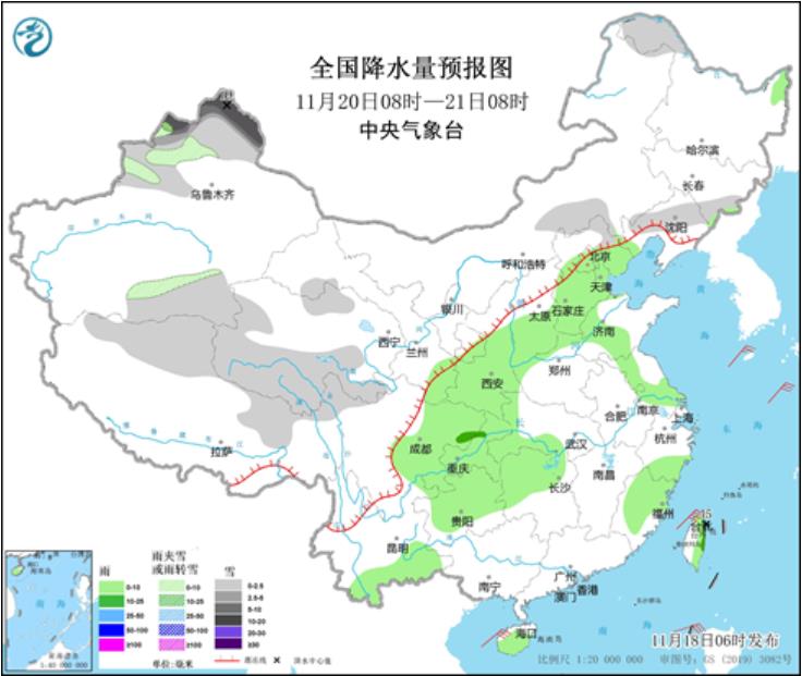11月20日08時(shí)至21日08時(shí),新疆北疆和南部、西藏北部、青海南部和西部等地部分地區(qū)有小到中雪或雨夾雪,其中,新疆北疆有大到暴雪(10~19毫米)。東北地區(qū)大部、江南東部和南部、云南南部、華南西部、海南島等地部分地區(qū)有小到中雨。(見(jiàn)圖4)。