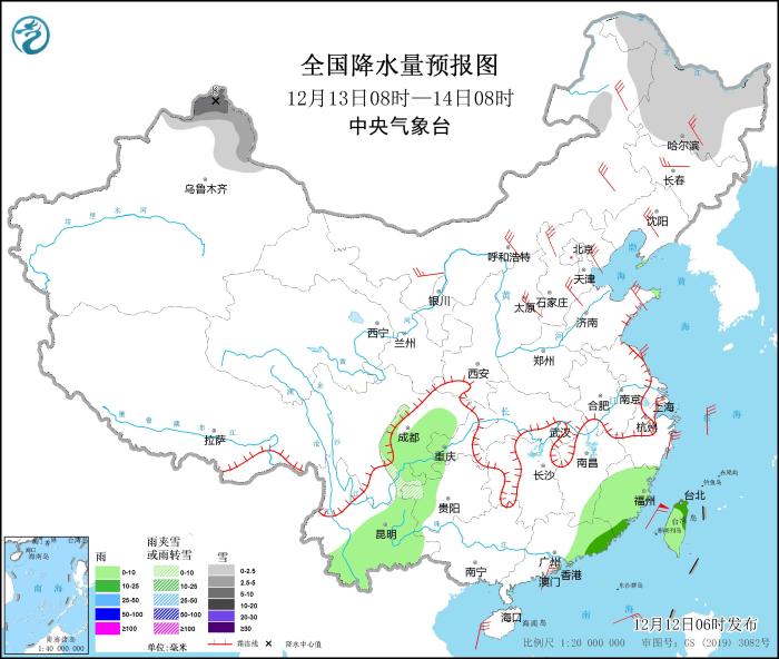 圖3 全國降水量預報圖(12月12日08時-13日08時)