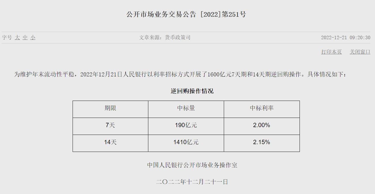 中新網(wǎng)12月21日電 據(jù)央行官網(wǎng)消息,為維護年末流動性平穩(wěn),2022年12月21日人民銀行以利率招標(biāo)方式開展了1600億元7天期和14天期逆回購操作。中標(biāo)利率分別為2.00%和2.15%。(中新財經(jīng))