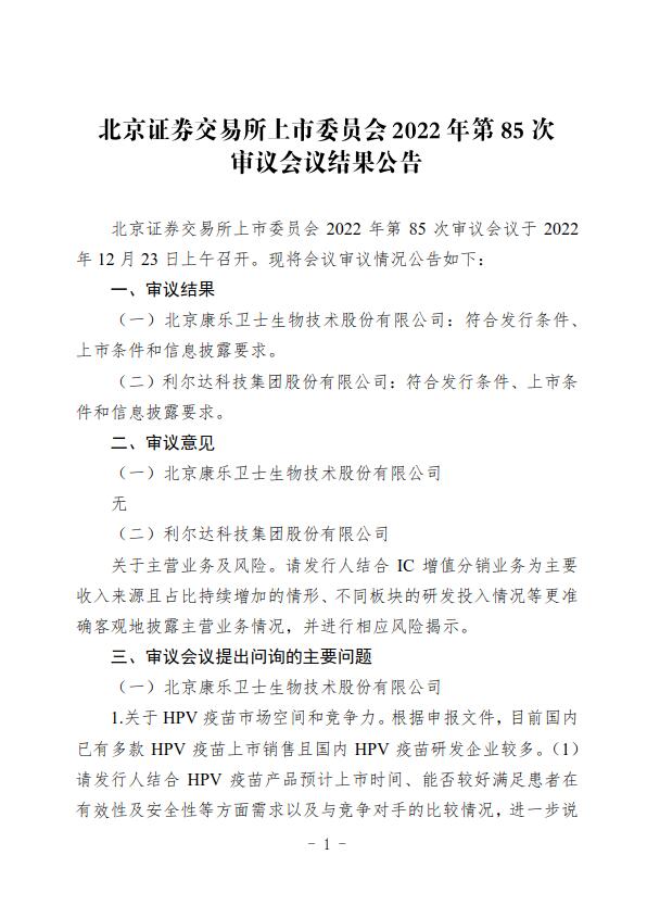 中新網(wǎng)12月26日電 北京證券交易所網(wǎng)站消息,北京證券交易所上市委員會2022年第85次審議會議于2022年12月23日上午召開。審議結(jié)果顯示,北京康樂衛(wèi)士生物技術(shù)股份有限公司、利爾達(dá)科技集團(tuán)股份有限公司符合發(fā)行條件、上市條件和信息披露要求。