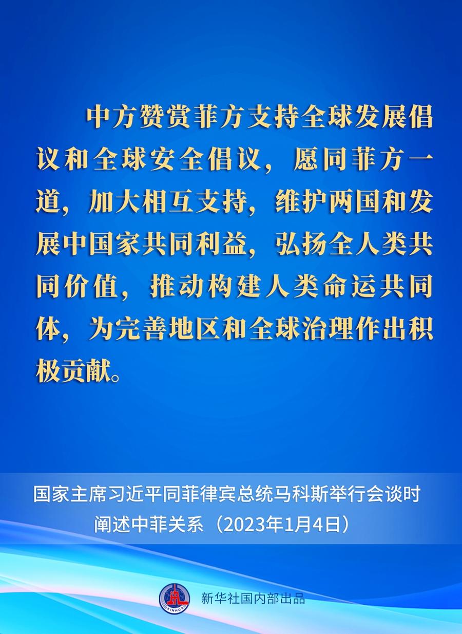1月4日下午,國家主席習(xí)近平在人民大會堂同來華進(jìn)行國事訪問的菲律賓總統(tǒng)馬科斯舉行會談。關(guān)于中菲關(guān)系,習(xí)近平主席在會談中作出一系列重要闡述。一起來看要點。