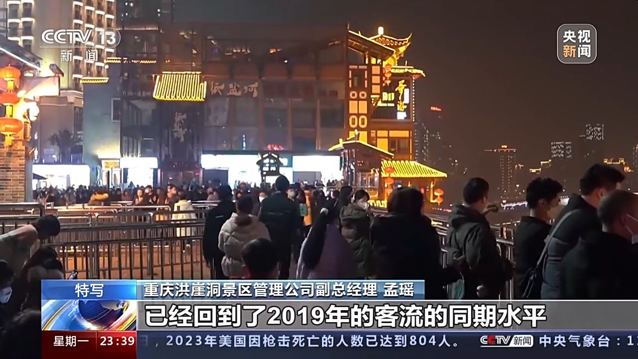 重慶洪崖洞景區(qū)管理公司副總經(jīng)理 孟瑤:本來(lái)按照我們的預(yù)估,可能會(huì)在今年的二到三月份,游客量會(huì)有一個(gè)明顯的回升。元旦的第一天和第二天,我們的客流分別已經(jīng)達(dá)到了6.4萬(wàn)和6.2萬(wàn),已經(jīng)回到了2019年的客流的同期水平,甚至已經(jīng)超過(guò)了17%。