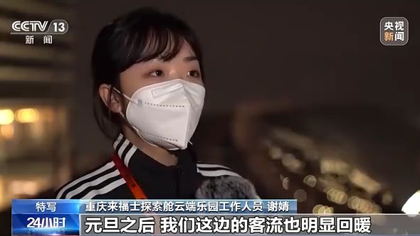 重慶來(lái)福士探索艙云端樂(lè)園工作人員謝婧:元旦之后,我們這邊的客流也明顯回暖,同比疫情之前客流明顯回暖到7成左右。