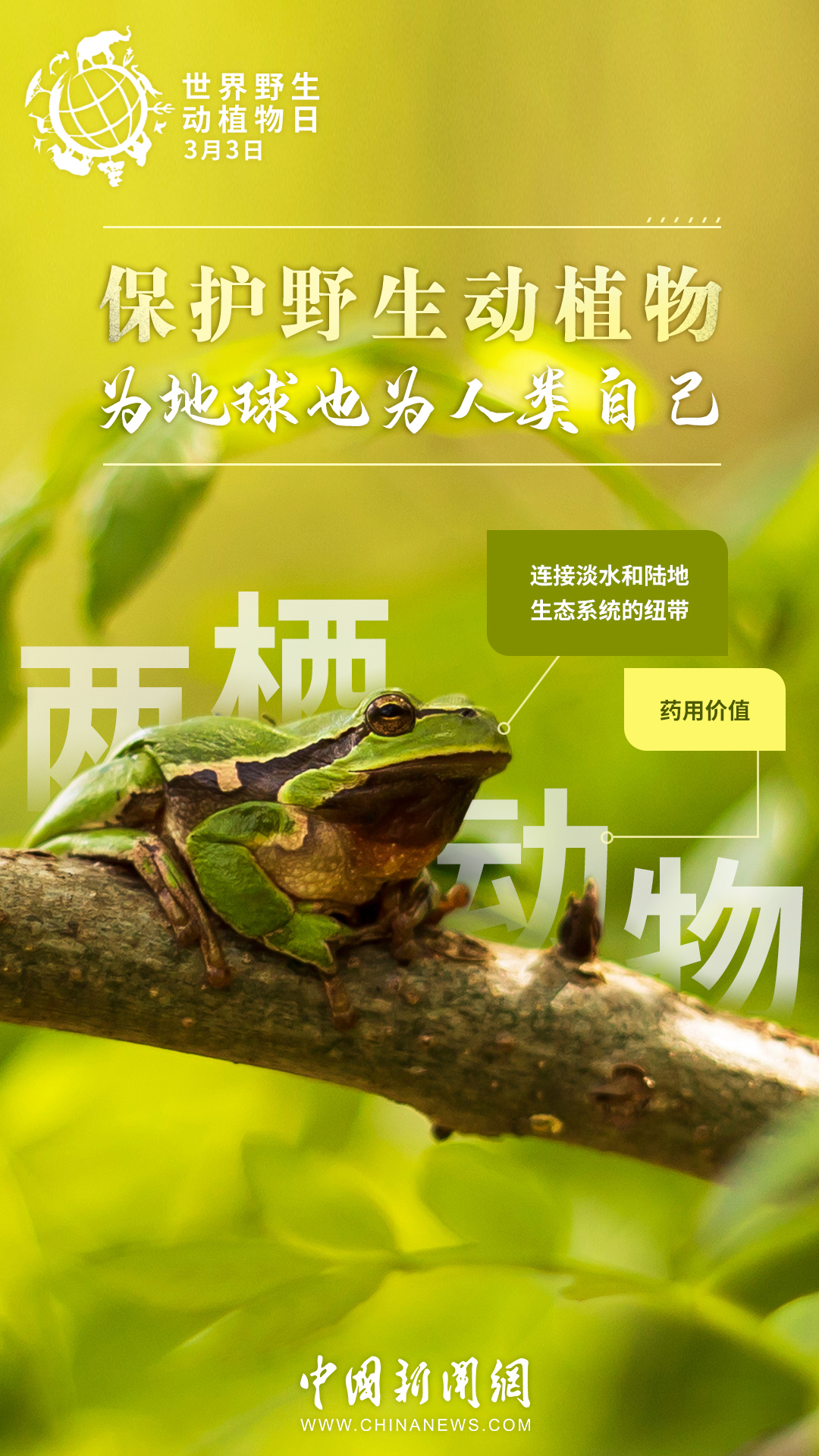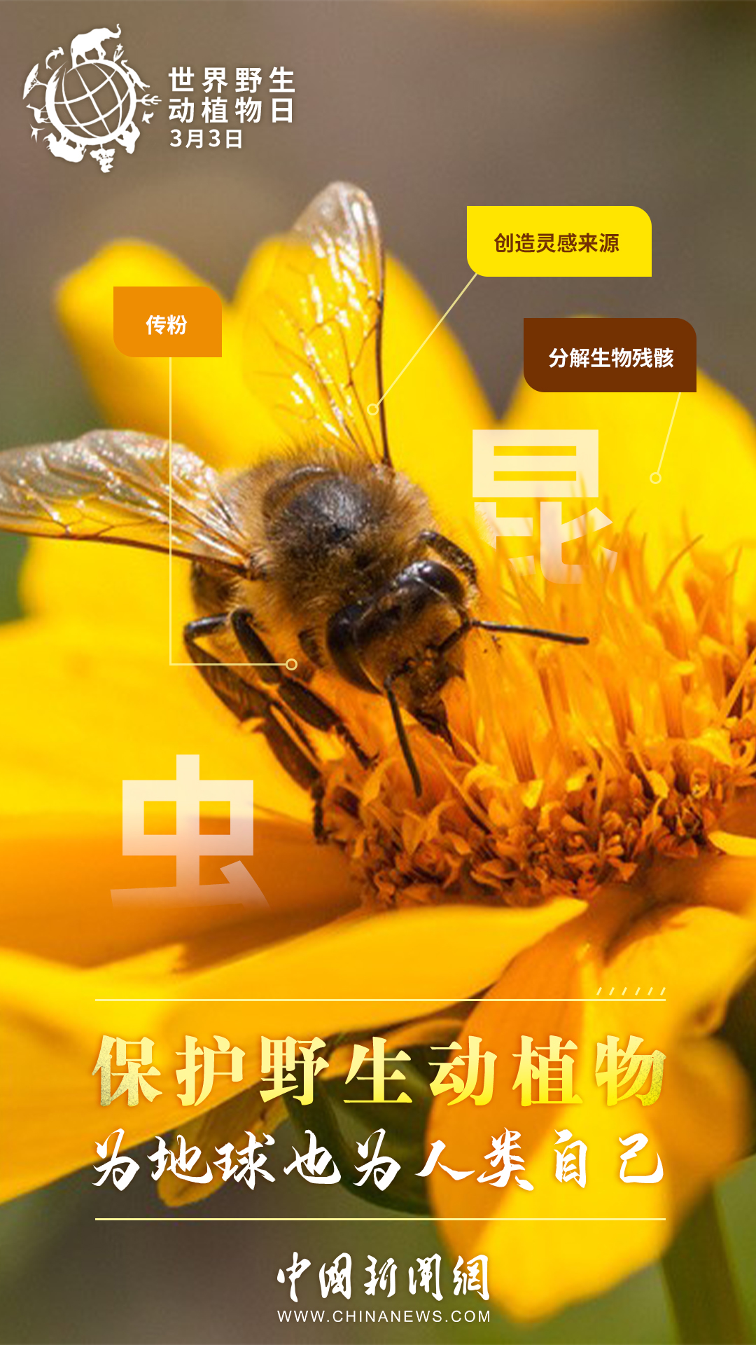 世界約80%的農(nóng)作物都依賴蜜蜂等蟲媒傳粉,一座鯨的尸體可以供養(yǎng)一套以分解者為主的循環(huán)系統(tǒng)長達百年……其實,大自然里的每種生物都有它存在的價值。今天是第十個“世界野生動植物日”,戳圖了解它們的作用,一起來保護野生動植物。