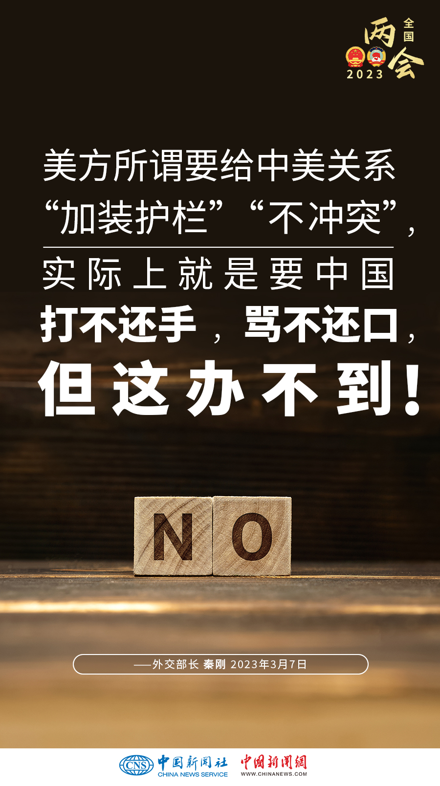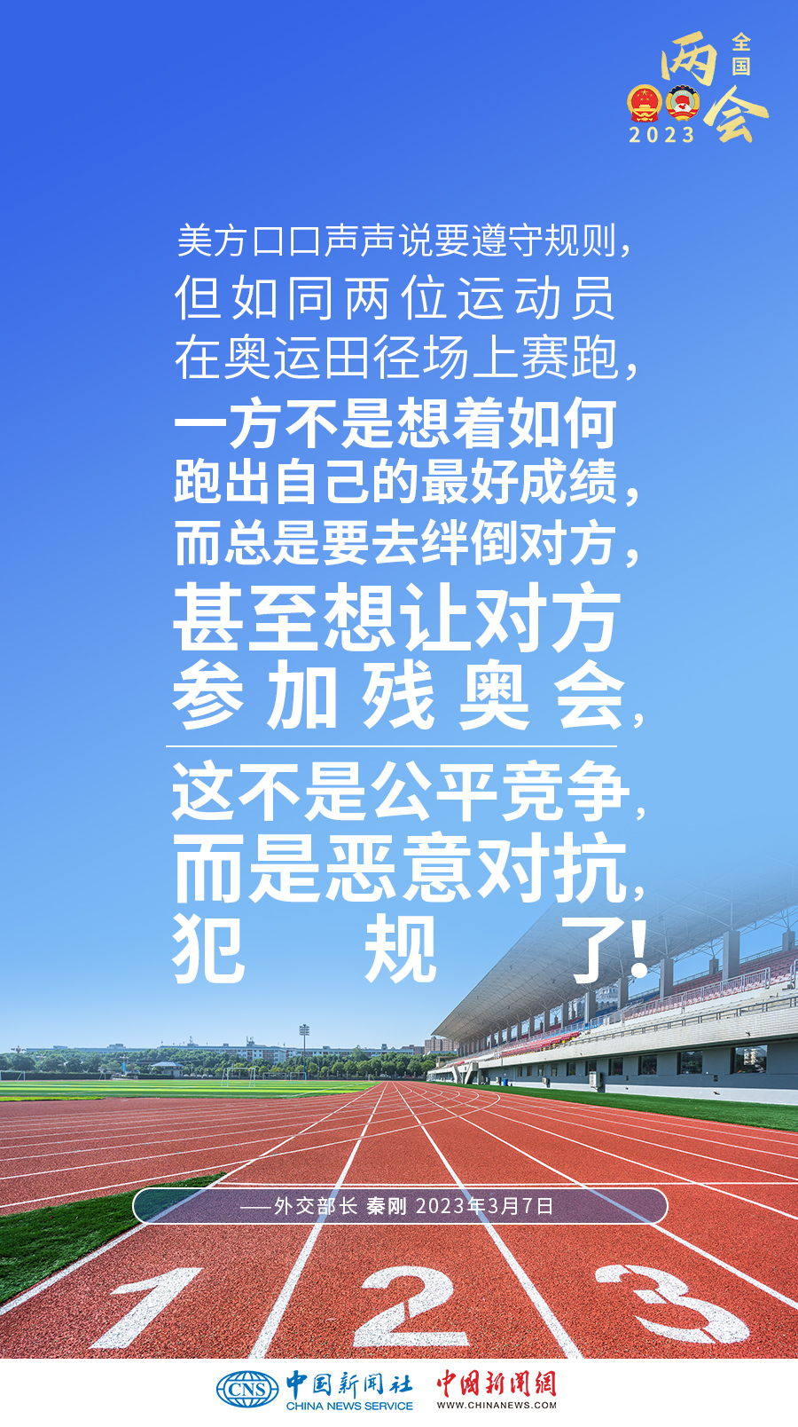 秦剛:美方聲稱要“競贏”中國但不尋求沖突。但實際上,美方的所謂“競爭”,就是全方位遏制打壓,就是你死我活的零和博弈。美方口口聲聲說要遵守規(guī)則,但如同兩位運動員在奧運田徑場上賽跑,一方不是想著如何跑出自己的最好成績,而總是要去絆倒對方,甚至想讓對方參加殘奧會,這不是公平競爭,而是惡意對抗,犯規(guī)了!美方所謂要給中美關(guān)系“加裝護欄”“不沖突”,實際上就是要中國打不還手,罵不還口,但這辦不到!