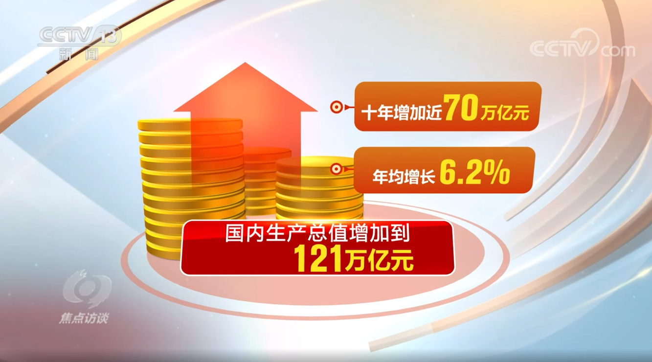 這五年,我國(guó)經(jīng)濟(jì)發(fā)展再上新臺(tái)階。國(guó)內(nèi)生產(chǎn)總值增加到121萬(wàn)億元,五年年均增長(zhǎng)5.2%,十年增加近70萬(wàn)億元、年均增長(zhǎng)6.2%,在高基數(shù)基礎(chǔ)上實(shí)現(xiàn)了中高速增長(zhǎng)、邁向高質(zhì)量發(fā)展。