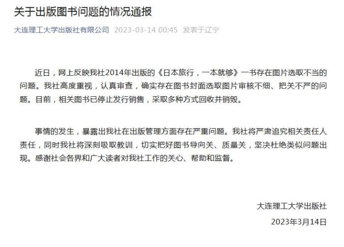 中新網(wǎng)3月14日電 據(jù)大連理工大學(xué)出版社有限公司官方微信消息,大連理工大學(xué)出版社14日發(fā)布情況通報(bào)稱,近日,網(wǎng)上反映大連理工大學(xué)出版社2014年出版的《日本旅行,一本就夠》一書(shū)存在圖片選取不當(dāng)?shù)膯?wèn)題。該社高度重視,認(rèn)真審查,確實(shí)存在圖書(shū)封面選取圖片審核不細(xì)、把關(guān)不嚴(yán)的問(wèn)題。目前,相關(guān)圖書(shū)已停止發(fā)行銷售,采取多種方式回收并銷毀。