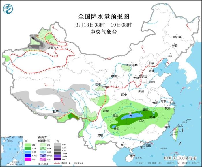 3月16日08時至17日08時,新疆沿天山地區(qū)和伊犁河谷、西藏東部和南部、青海東部和南部、川西高原等地部分地區(qū)有小到中雪或雨夾雪,局地有大雪(5~7毫米)。黃淮西部、江淮西部、江漢、江南北部和西部、西南地區(qū)東部等地部分地區(qū)有中到大雨,其中,貴州東部、湖南北部等地局地有暴雨(50~80毫米)。內(nèi)蒙古中東部、東北地區(qū)、浙江北部等地部分地區(qū)有4~6級風。