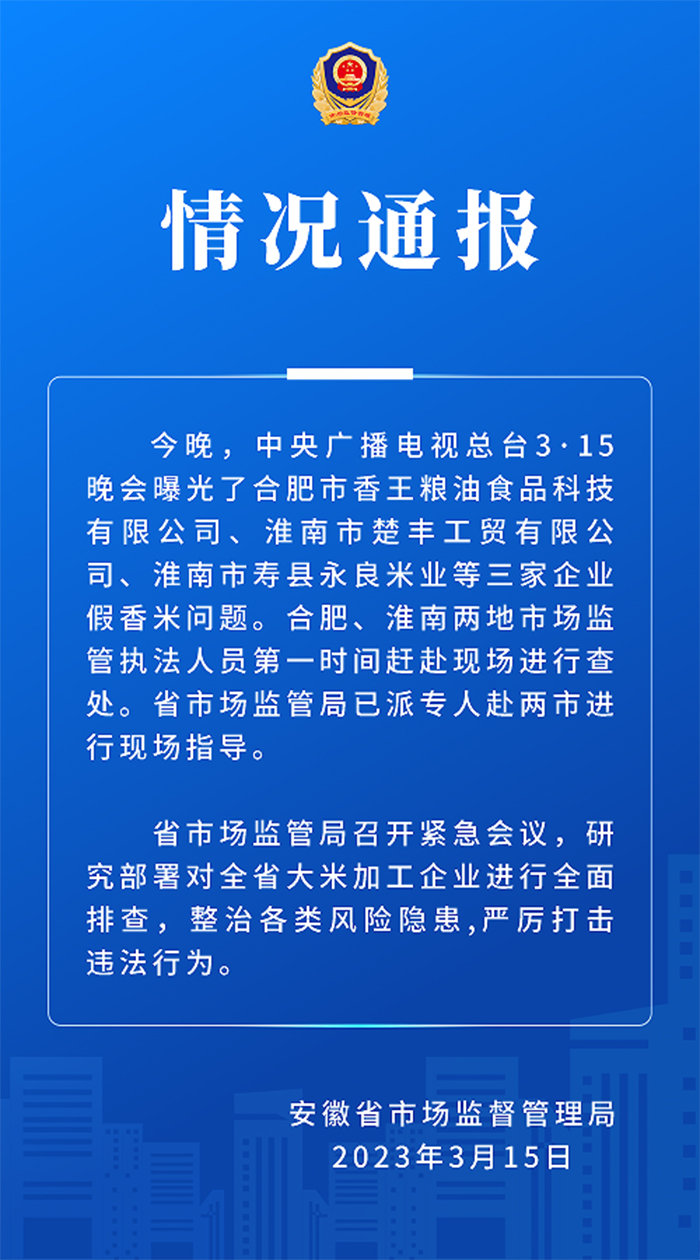 安徽省市場監(jiān)督管理局:已查處三家涉假香米問題企業(yè)