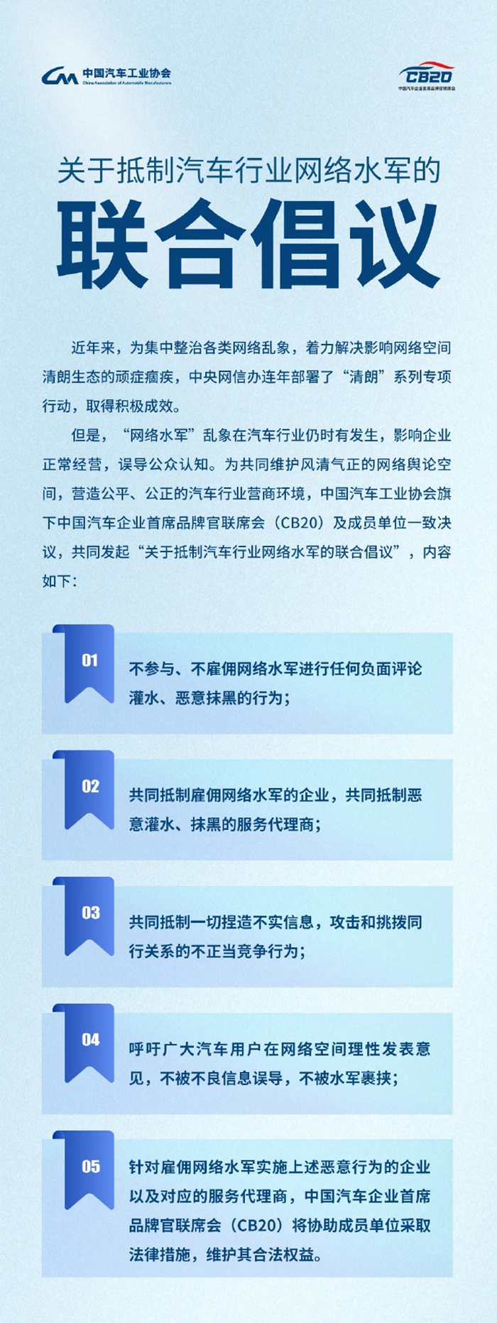5、針對雇傭網(wǎng)絡(luò)水軍實(shí)施上述惡意行為的企業(yè)以及對應(yīng)的服務(wù)代理商,中國汽車企業(yè)首席品牌官聯(lián)席會(huì)(CB20)將協(xié)助成員單位采取法律措施,維護(hù)其合法權(quán)益。(完)