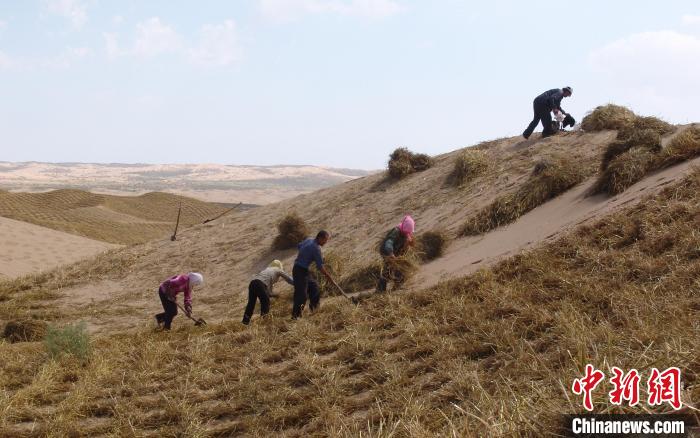 白芨灘林場(chǎng)員工扎麥草方格進(jìn)行治沙(資料圖)?!幭撵`武白芨灘國(guó)家級(jí)自然保護(hù)區(qū)管理局供圖