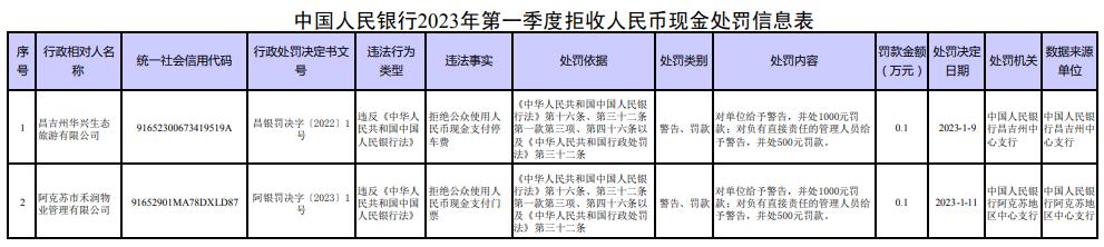 2023年第一季度,人民銀行依法對昌吉州華興生態(tài)旅游有限公司、阿克蘇市禾潤物業(yè)管理有限公司等2家拒收人民幣現(xiàn)金的單位及相關(guān)責任人作出經(jīng)濟處罰。