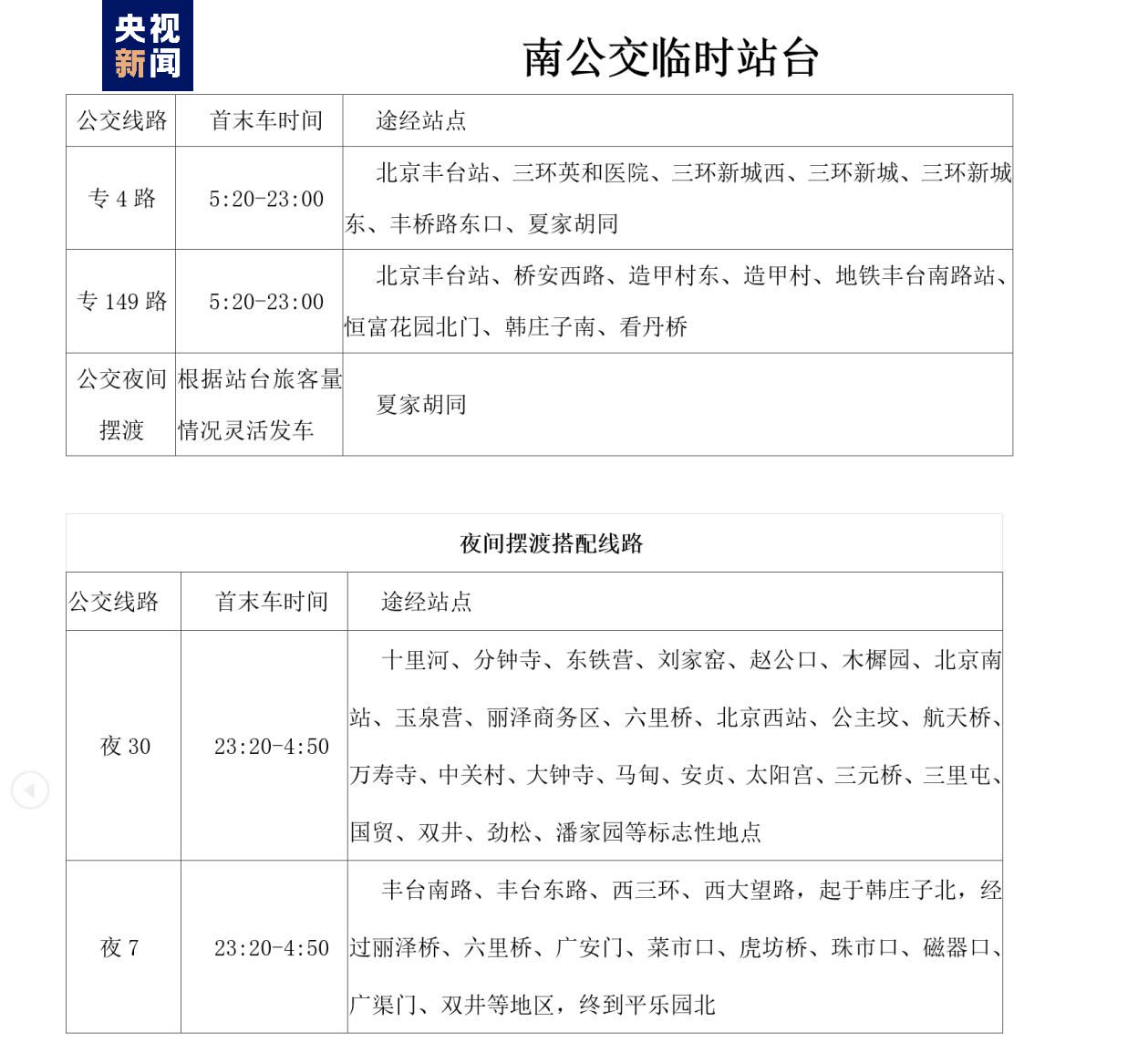 0時至5時,北京豐臺站,在出租車調(diào)度站及南廣場臨時公交站臺區(qū)域設有免費擺渡車幫助旅客離站,共計兩個方向,具體如下: