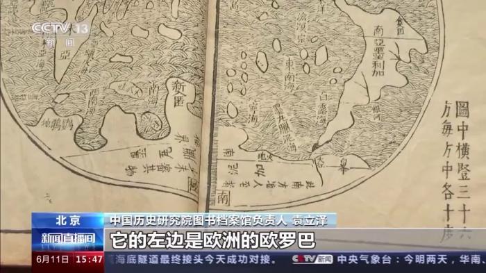 中國(guó)歷史研究院圖書檔案館負(fù)責(zé)人 袁立澤:這幅圖是16世紀(jì)末,西方第一批來(lái)華傳教士利瑪竇主持繪制的。把西方當(dāng)時(shí)先進(jìn)的制圖技術(shù)帶到了中國(guó),同時(shí)他有意識(shí)地吸收了中國(guó)的制圖經(jīng)驗(yàn)和理念。今天我們所熟悉的七大洲四大洋,在圖中應(yīng)該說(shuō)已經(jīng)標(biāo)示出了六大洲和三大洋,就是亞洲的亞細(xì)亞。它的左邊是歐洲的歐羅巴,南面就是今天的非洲叫利未亞,改變了以往以歐洲為中心的繪圖方式。它是中西文明交流互鑒的一個(gè)結(jié)晶和有力見證。