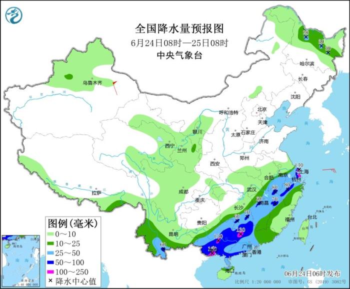 全國降水量預(yù)報(bào)圖(6月24日08時(shí)-25日08時(shí))