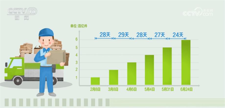 今年以來,從2月8日我國快遞業(yè)務(wù)量超100億件起,每個(gè)月快遞業(yè)務(wù)量都以百億件為增量。28天,快遞業(yè)務(wù)量從100億件到200億件(3月8日),29天達(dá)300億件(4月6日),28天從300億件到400億件(5月4日),27天達(dá)500億件(5月31日),從500億件到600億件(6月24日)只花了24天。