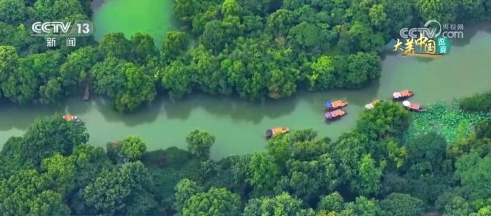 這里是杭州西溪國家濕地公園。盛夏時(shí)節(jié),杭州西溪濕地草木蔥蘢、綠樹成蔭,鷺舞燕翔、荷香魚躍,星羅棋布的魚塘呈現(xiàn)出“萬塘攬勝”的美景。這里生態(tài)資源豐富,有維管束植物739種、鳥類203種、昆蟲911種、魚類56種。二十年來,杭州西溪濕地以保護(hù)原生態(tài)為目標(biāo),統(tǒng)籌生產(chǎn)、生活、生態(tài)三大空間布局,探索了一條濕地保護(hù)與利用雙贏的道路。
