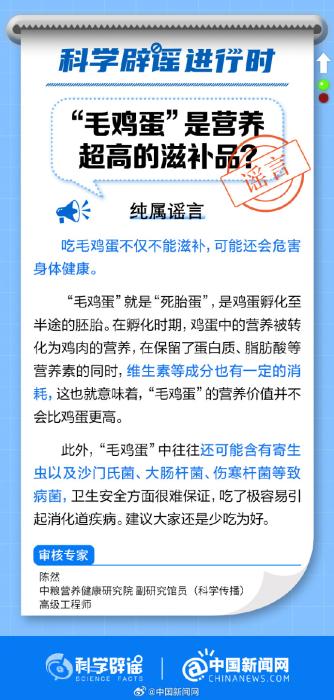 純屬謠言!“毛雞蛋”就是“死胎蛋”,是雞蛋孵化至半途的胚胎?!懊u蛋”的營(yíng)養(yǎng)價(jià)值并不比雞蛋更高,其中還可能含有寄生蟲以及沙門氏菌、大腸桿菌、傷寒桿菌等致病菌,衛(wèi)生安全很難保證,吃了極容易引起消化道疾病。(來(lái)源:科學(xué)辟謠、中國(guó)新聞網(wǎng)微博)