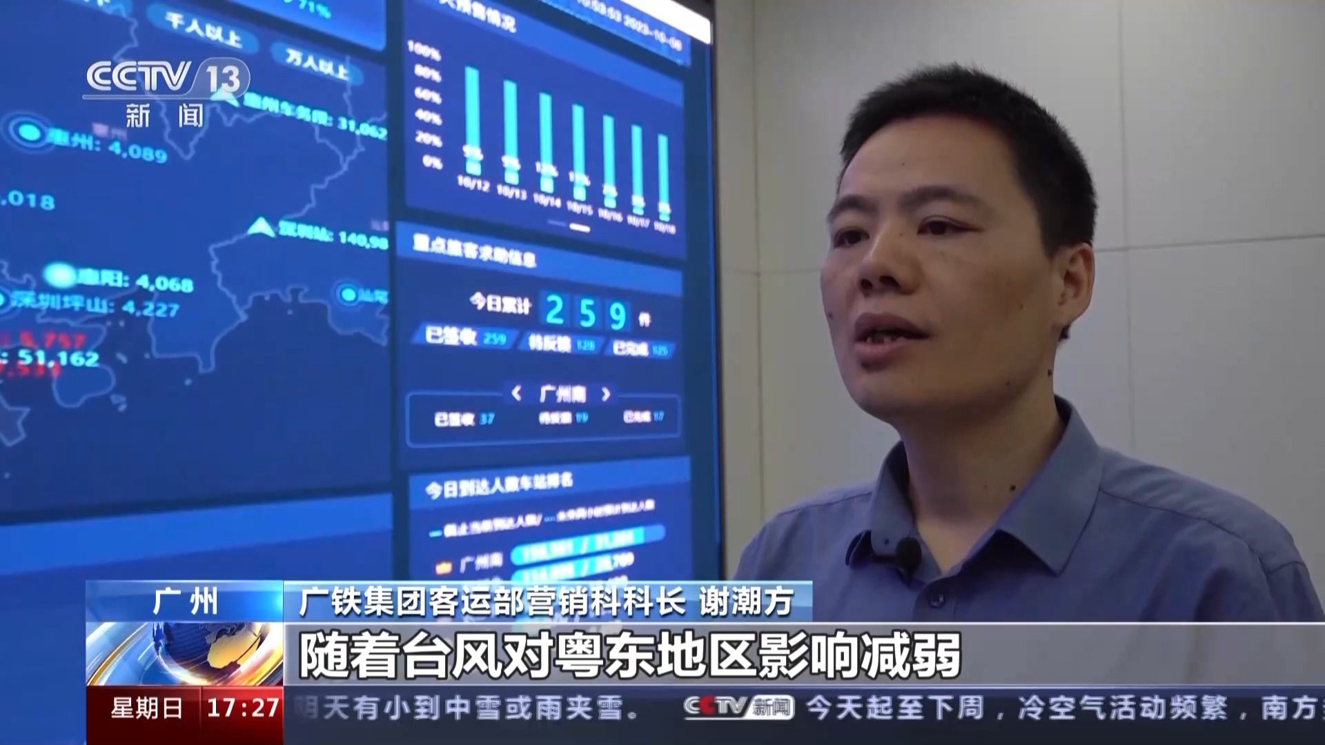 廣鐵集團(tuán)客運(yùn)部營(yíng)銷(xiāo)科科長(zhǎng)謝潮方:隨著臺(tái)風(fēng)對(duì)粵東地區(qū)影響減弱,今天,杭深、廣汕等線(xiàn)路列車(chē)運(yùn)行秩序恢復(fù)正常。中秋國(guó)慶假期的后幾天,仍是返程客流高峰,我們將加強(qiáng)線(xiàn)路檢查,確保運(yùn)輸安全。