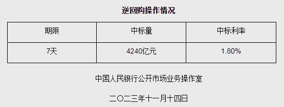 中新網(wǎng)11月14日電 據(jù)央行網(wǎng)站消息,為維護(hù)銀行體系流動性合理充裕,2023年11月14日人民銀行以利率招標(biāo)方式開展了4240億元逆回購操作,中標(biāo)利率1.80%,期限為7天。具體情況如下:
