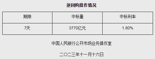 中新網(wǎng)11月16日電 據(jù)央行網(wǎng)站消息,為維護(hù)銀行體系流動性合理充裕,2023年11月16日人民銀行以利率招標(biāo)方式開展了3770億元逆回購操作,中標(biāo)利率1.80%,期限為7天。具體情況如下: