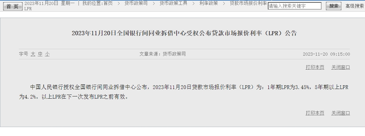 中新網(wǎng)11月20日電 據(jù)央行網(wǎng)站消息,中國人民銀行授權全國銀行間同業(yè)拆借中心公布,2023年11月20日貸款市場報價利率(LPR)為:1年期LPR為3.45%,5年期以上LPR為4.2%。以上LPR在下一次發(fā)布LPR之前有效。