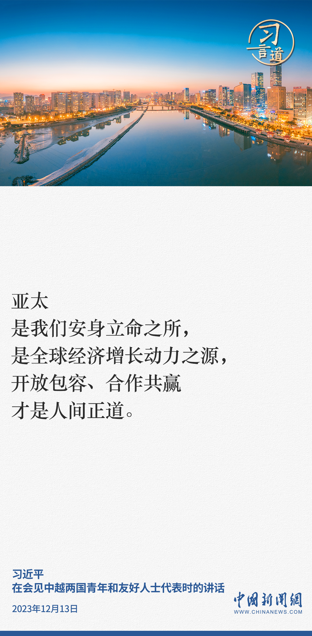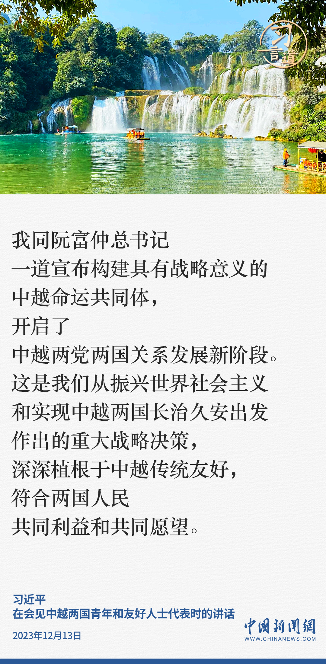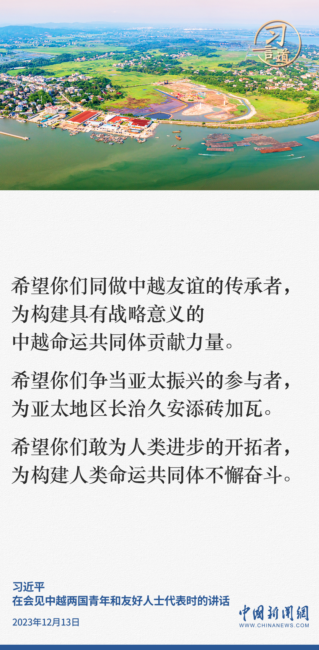 當?shù)貢r間12月13日下午,中共中央總書記、國家主席習近平和夫人彭麗媛在河內同越共中央總書記阮富仲夫婦共同會見中越兩國青年和友好人士代表。習近平指出——