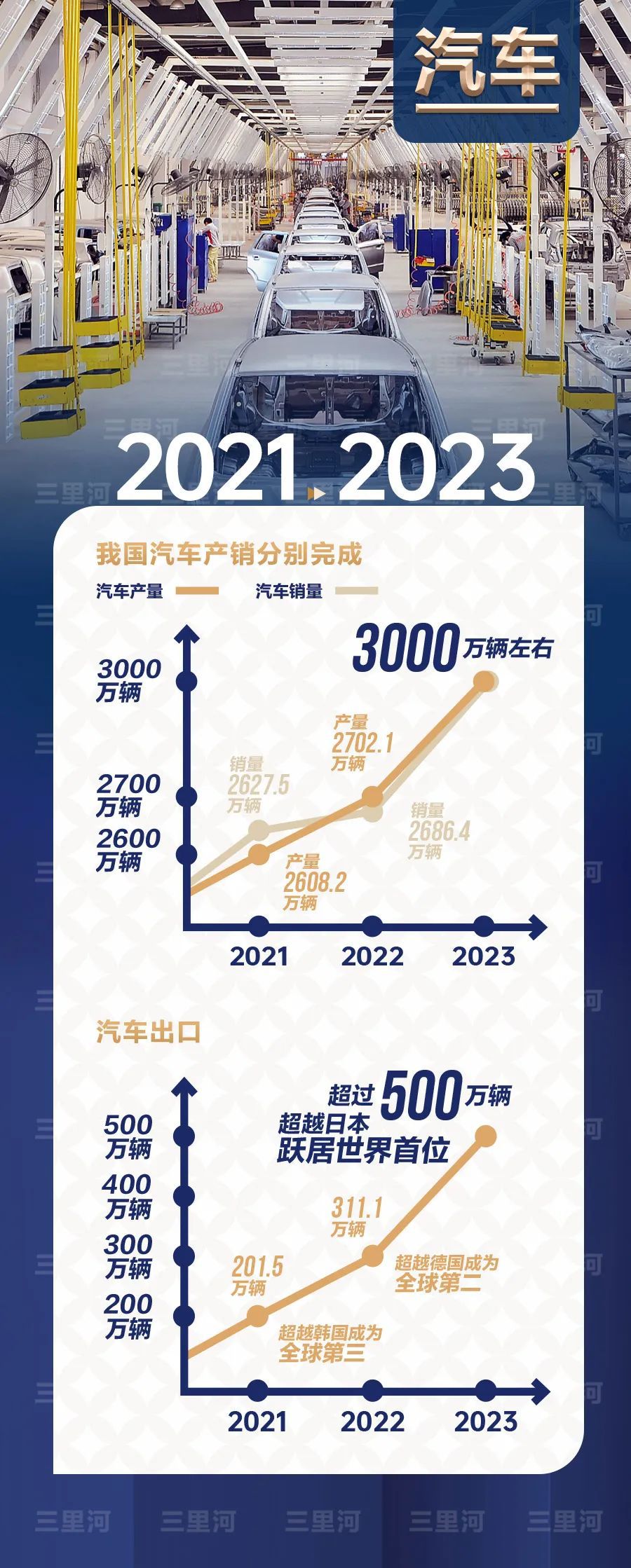 2023年,全年汽車產(chǎn)銷量預(yù)計(jì)達(dá)3000萬輛左右、創(chuàng)歷史新高,出口超過500萬輛,超越日本,躍居世界首位。