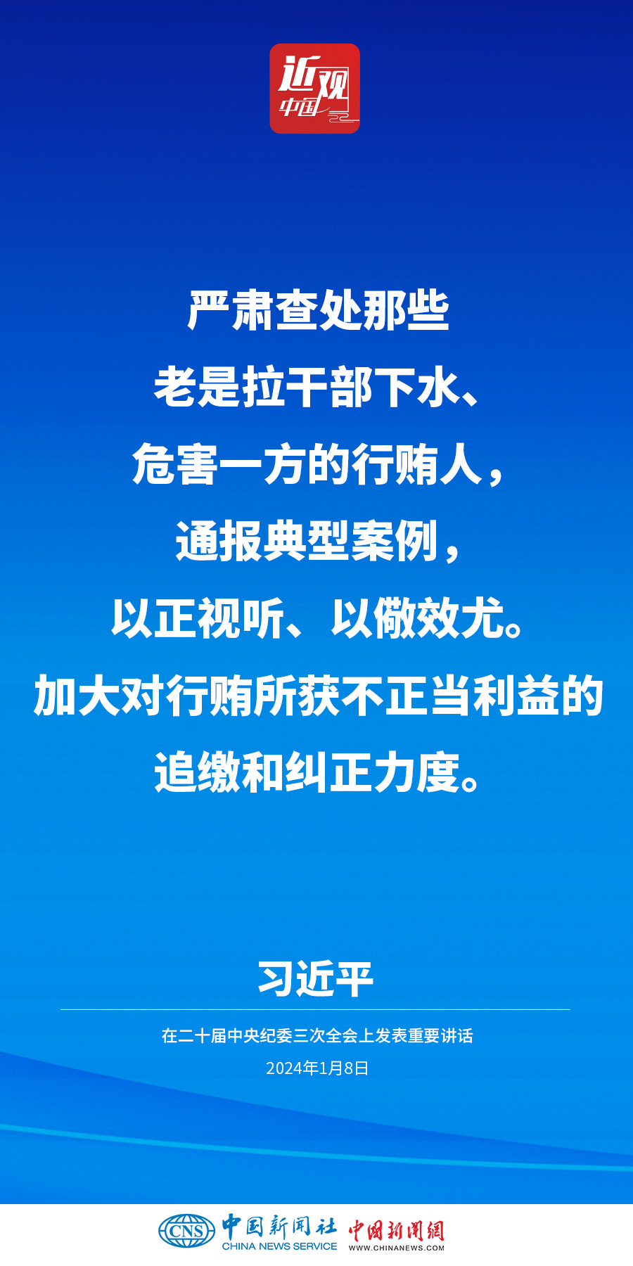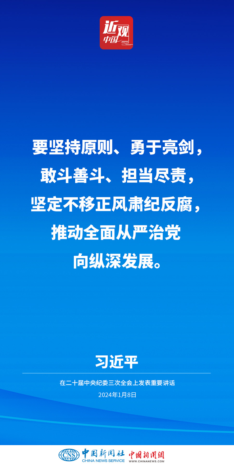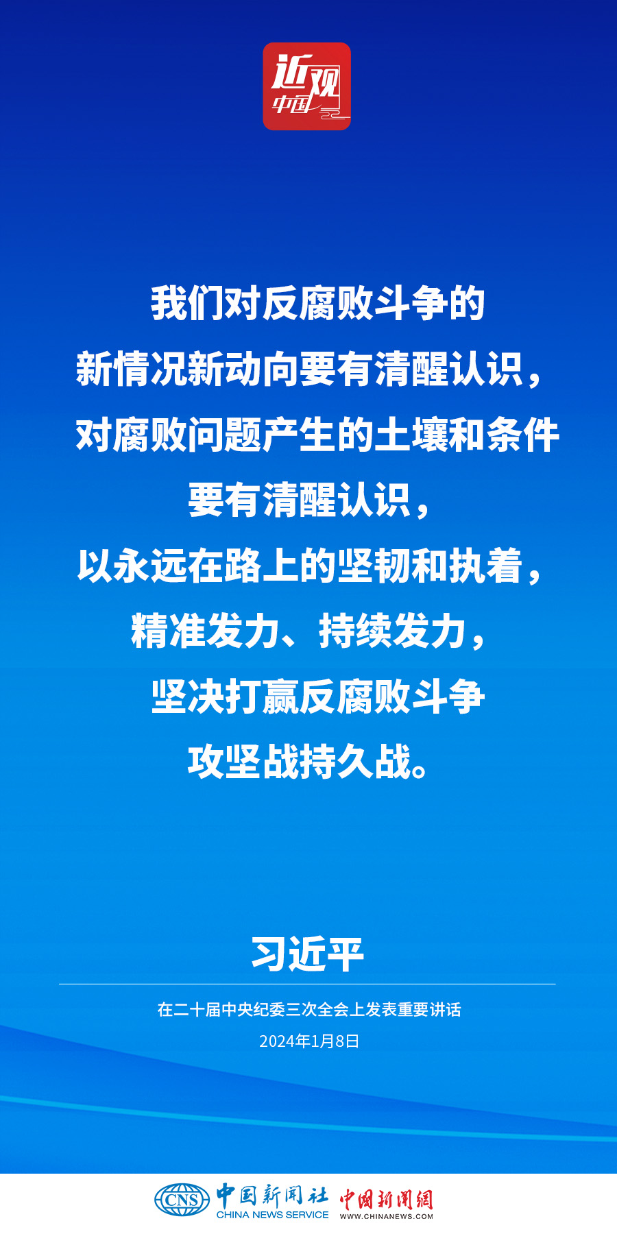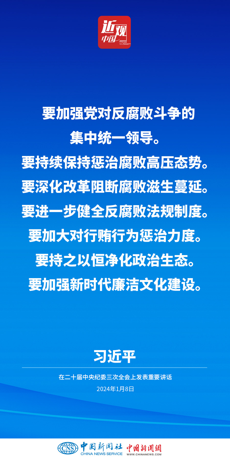 中共中央總書記、國家主席、中央軍委主席習近平8日上午在中國共產(chǎn)黨第二十屆中央紀律檢查委員會第三次全體會議上發(fā)表重要講話。他強調(diào)——