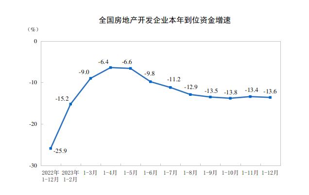 2023年,房地產(chǎn)開發(fā)企業(yè)到位資金127459億元,比上年下降13.6%。其中,國內(nèi)貸款15595億元,下降9.9%;利用外資47億元,下降39.1%;自籌資金41989億元,下降19.1%;定金及預(yù)收款43202億元,下降11.9%;個人按揭貸款21489億元,下降9.1%。