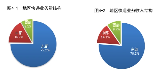 2023年,東、中、西部地區(qū)快遞業(yè)務(wù)量比重分別為75.2%、16.7%和8.1%,業(yè)務(wù)收入比重分別為76.2%、14.1%和9.7%。與去年同期相比,東部地區(qū)快遞業(yè)務(wù)量比重下降1.6個百分點(diǎn),快遞業(yè)務(wù)收入比重下降1.4個百分點(diǎn);中部地區(qū)快遞業(yè)務(wù)量比重上升1.0個百分點(diǎn),快遞業(yè)務(wù)收入比重上升0.7個百分點(diǎn);西部地區(qū)快遞業(yè)務(wù)量比重上升0.6個百分點(diǎn),快遞業(yè)務(wù)收入比重上升0.7個百分點(diǎn)。