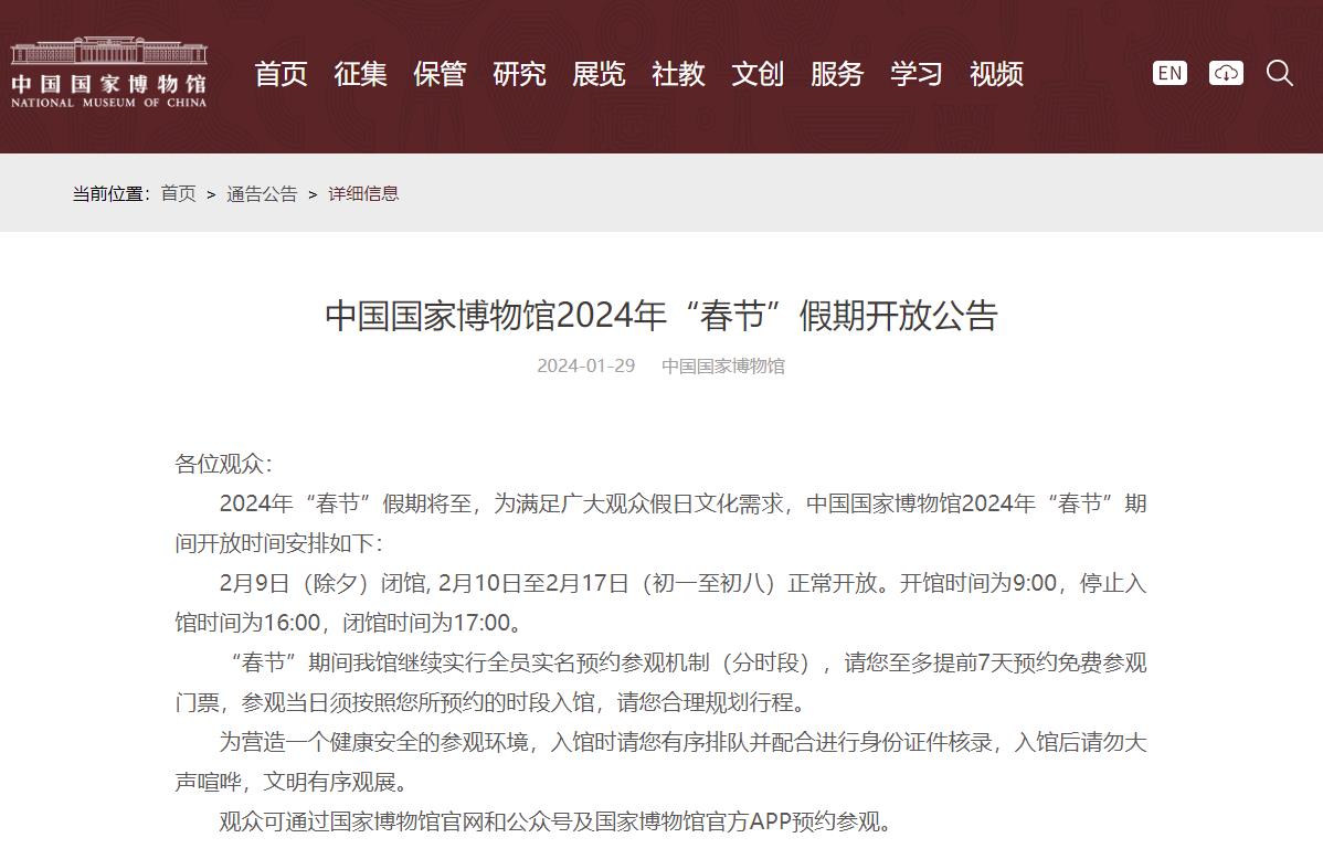 中國(guó)國(guó)家博物館:除夕閉館,初一至初八正常開放
