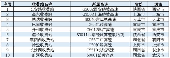 春節(jié)期間,全國(guó)高速公路預(yù)計(jì)易發(fā)生擁堵緩行的收費(fèi)站,如下表所示。