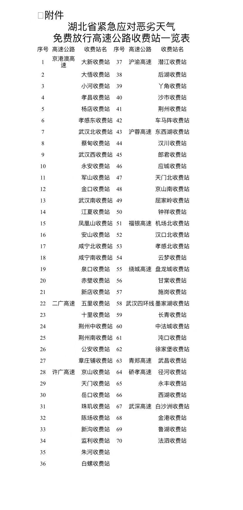 中新網(wǎng)2月6日電 記者6日從交通運(yùn)輸部獲悉,針對(duì)近日湖北省境內(nèi)部分高速公路路段因惡劣天氣造成車輛擁堵嚴(yán)重的情況,結(jié)合最新天氣預(yù)報(bào)及路網(wǎng)運(yùn)行情況,經(jīng)湖北省人民政府和交通運(yùn)輸部同意,調(diào)整免費(fèi)放行收費(fèi)站所及時(shí)間區(qū)間,自2024年2月5日20:00至6日12:00,對(duì)在指定收費(fèi)站駛出高速公路的所有車輛實(shí)施免費(fèi)放行。具體70座收費(fèi)站如下↓(中新財(cái)經(jīng))