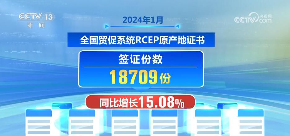 2024年1月,全國貿(mào)促系統(tǒng)RCEP原產(chǎn)地證書簽證份數(shù)為18709份,同比增長15.08%;辦證企業(yè)3640家,同比增長10.40%,出口目的國包括日本、印尼、韓國、越南等13個成員國,預(yù)計(jì)共為我國產(chǎn)品在RCEP進(jìn)口成員國減免關(guān)稅0.09億美元,RCEP的政策紅利在持續(xù)釋放。