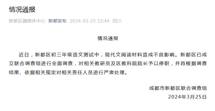 初三語文測(cè)試閱讀材料造成不良影響 成都新都發(fā)通報(bào)