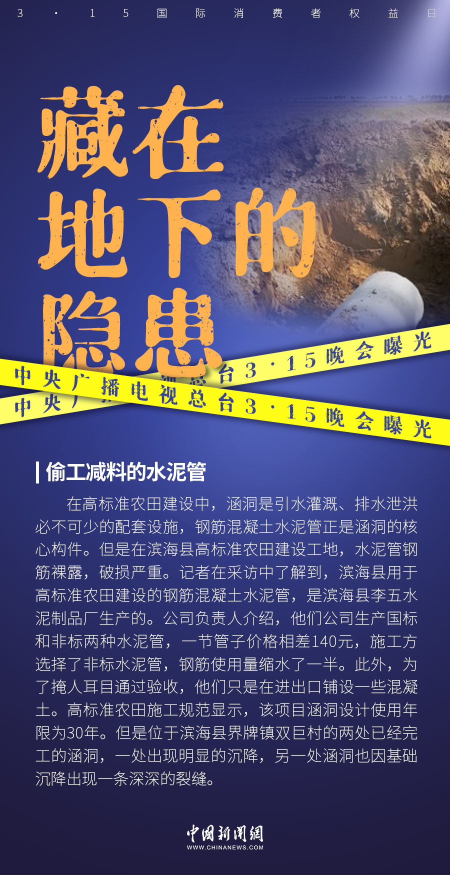 晚會曝光江蘇省鹽城市濱海縣高標準農(nóng)田的地下漏洞,用于建設的鋼筋混凝土水泥管存在偷工減料問題。施工方選擇了非標水泥管,鋼筋使用量縮水了一半。中新財經(jīng)記者從鹽城市場監(jiān)管局獲悉,工作人員已經(jīng)行動,后續(xù)信息會及時對外公布。