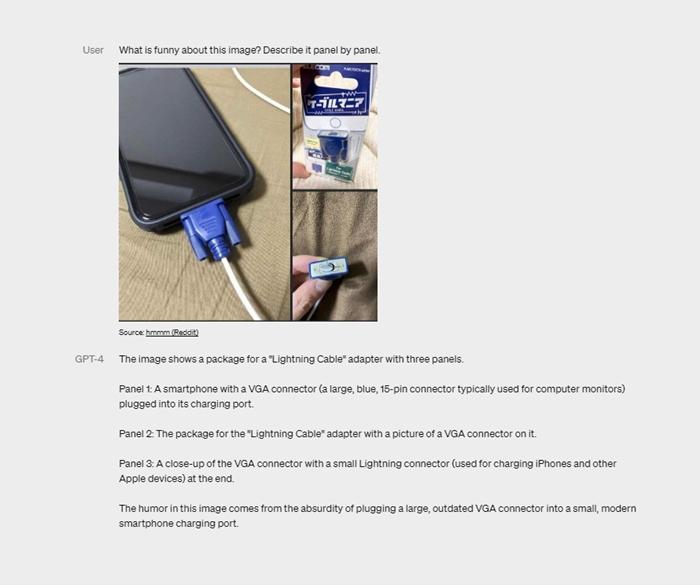 不過據(jù)OpenAI介紹,在輸入一張畫有VGA線連接手機(jī)充電接口內(nèi)容的圖像后,GPT-4除了能描述出這幅圖中的內(nèi)容,還能指出這張圖有哪些不對勁,“這幅圖中的幽默來自于將一個大的過時的VGA連接器插入一個小的現(xiàn)代化的智能手機(jī)充電端口?!?/p>