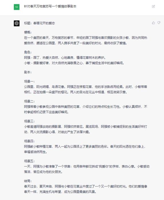 目前GPT-4僅限于ChatGPT Plus訂戶使用。記者體驗時發(fā)現(xiàn),GPT-4生成速度比較慢,但回答簡明扼要,更有創(chuàng)造性,無論是寫詩歌還是故事劇本都不在話下。例如它可以根據(jù)“春天萬物復(fù)蘇”賦詩一首或者寫成一個愛情故事的劇本。