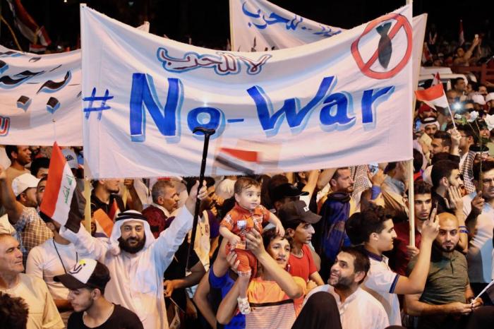 2019年5月24日,在伊拉克首都巴格達(dá),民眾在集會(huì)上舉著反戰(zhàn)橫幅。新華社發(fā)(哈利勒·達(dá)伍德攝)