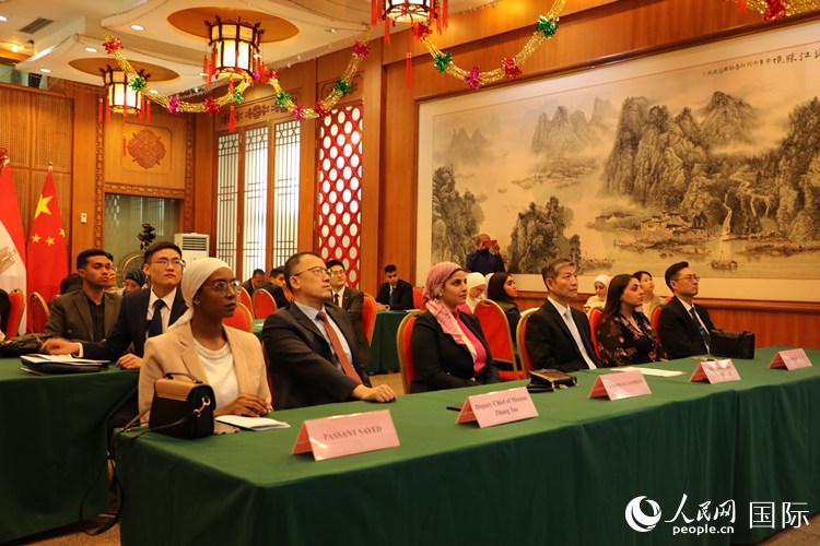 全體與會者共同觀看了阿文版《中國共產(chǎn)黨國際形象網(wǎng)宣片》。使館2名青年外交官代表結(jié)合自身工作經(jīng)歷,分別以《從三個關(guān)鍵詞讀懂中共二十大重要意義》和《從十年之變看中國式現(xiàn)代化》為題,深入淺出闡釋中共二十大的時代意義和深遠影響,以及中國式現(xiàn)代化對發(fā)展中國家的重要啟示。開羅大學3名師生代表結(jié)合自身工作和學習經(jīng)歷,積極分享對中國式現(xiàn)代化的認識和體會,高度評價中國發(fā)展成就,贊賞中國通過“一帶一路”合作助力埃及發(fā)展,表示愿為推動埃中關(guān)系進一步發(fā)展貢獻青春力量。