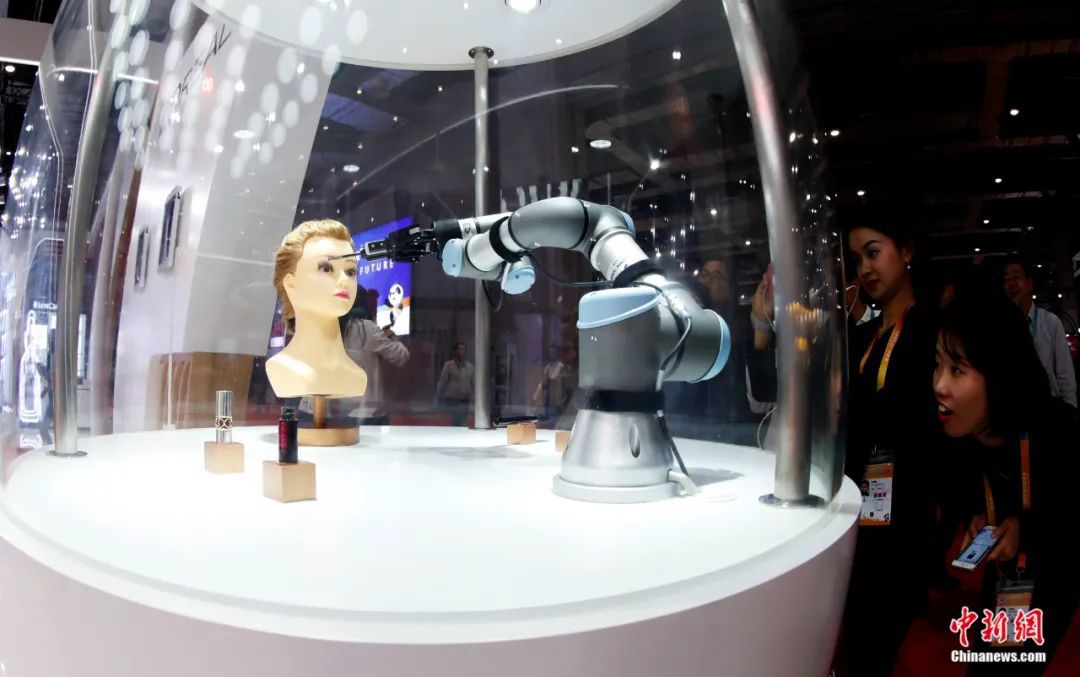 進(jìn)博會上,展商正在展示機(jī)器人化妝技術(shù)。湯彥俊攝