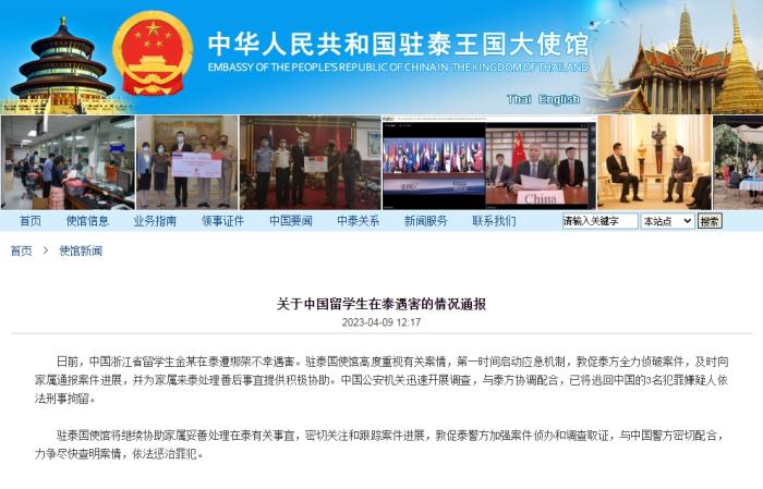 日前,中國(guó)浙江省留學(xué)生金某在泰遭綁架不幸遇害。駐泰國(guó)使館高度重視有關(guān)案情,第一時(shí)間啟動(dòng)應(yīng)急機(jī)制,敦促泰方全力偵破案件,及時(shí)向家屬通報(bào)案件進(jìn)展,并為家屬來(lái)泰處理善后事宜提供積極協(xié)助。中國(guó)公安機(jī)關(guān)迅速開展調(diào)查,與泰方協(xié)調(diào)配合,已將逃回中國(guó)的3名犯罪嫌疑人依法刑事拘留。