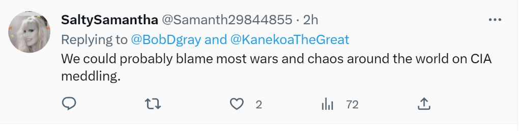 網(wǎng)友“有趣的薩曼莎”說:“世界上絕大多數(shù)的戰(zhàn)爭和混亂都是美國中央情報局帶來的吧?!?/p>