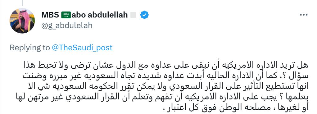 沙特網(wǎng)友阿博·阿卜杜勒拉言辭激烈地批評:“只有我們與其他國家保持敵意美國才不會失望嗎?美國政府對沙特表現(xiàn)出強烈而無理的敵意,居然還認為它可以影響沙特的決定、沙特只能在它的指導下做事?美國政府必須了解,沙特的決定不依附于任何其他人。祖國的利益高于一切。