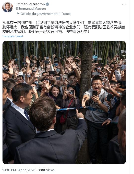 馬克龍寫道,“從北京一路到廣州,我見到了學(xué)習(xí)法語的大學(xué)生們,這些青年人飽含熱情、胸懷遠(yuǎn)大,我也見到了富有創(chuàng)新精神的企業(yè)家們,還有受到法國藝術(shù)靈感啟發(fā)的藝術(shù)家們。我們?cè)谝黄鸫笥锌蔀椤7ㄖ杏颜x萬歲!”
