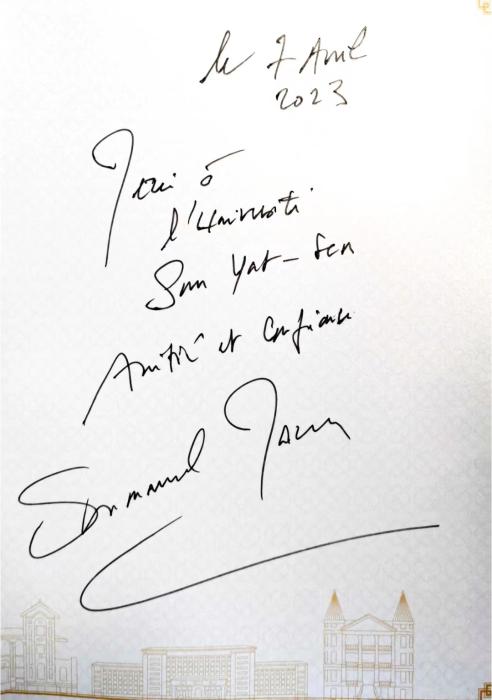 臨別之時(shí),馬克龍留下感言,為中山大學(xué)題字:“感謝中山大學(xué)的友誼與信任。埃馬紐埃爾·馬克龍,2023年4月7日?!?/p>
