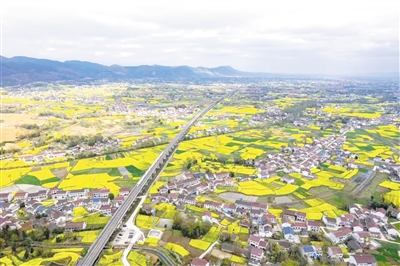 陜西省漢中市南鄭區(qū)岳家?guī)X村,一列動(dòng)車組列車在金燦燦的油菜花海中穿行。