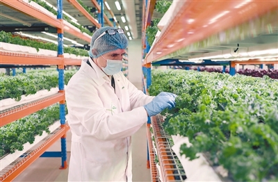 在阿聯(lián)酋迪拜“我的菜園”垂直農(nóng)場(chǎng)里,技術(shù)人員在查看蔬菜生長(zhǎng)情況。