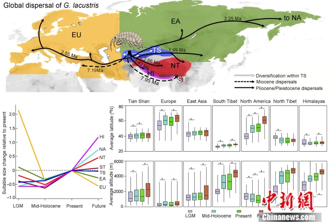 此次野外調(diào)查研究發(fā)現(xiàn),高山湖泊是冷水性鉤蝦全球遷移擴(kuò)展的通道,更新世氣候變冷形成大量高山湖泊或冰川湖,驅(qū)動鉤蝦多次從天山拓殖到全球高山湖泊以及環(huán)北寒帶冰川湖泊中,該研究定義這種新的分化方式為“出芽式分化”。研究還發(fā)現(xiàn),未來氣候變暖將導(dǎo)致鉤蝦局限在更高海拔更高緯度,造成遺傳多樣性降低。